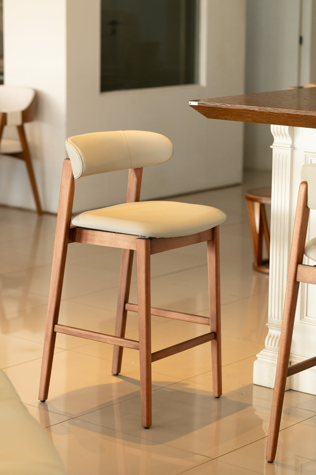 Com estrutura em madeira natural e estofamento revestido em couro, a Banqueta Lua entrega sofisticação e praticidade no dia a dia. O assento anatômico e o apoio para os pés garantem conforto mesmo em longos momentos de uso.