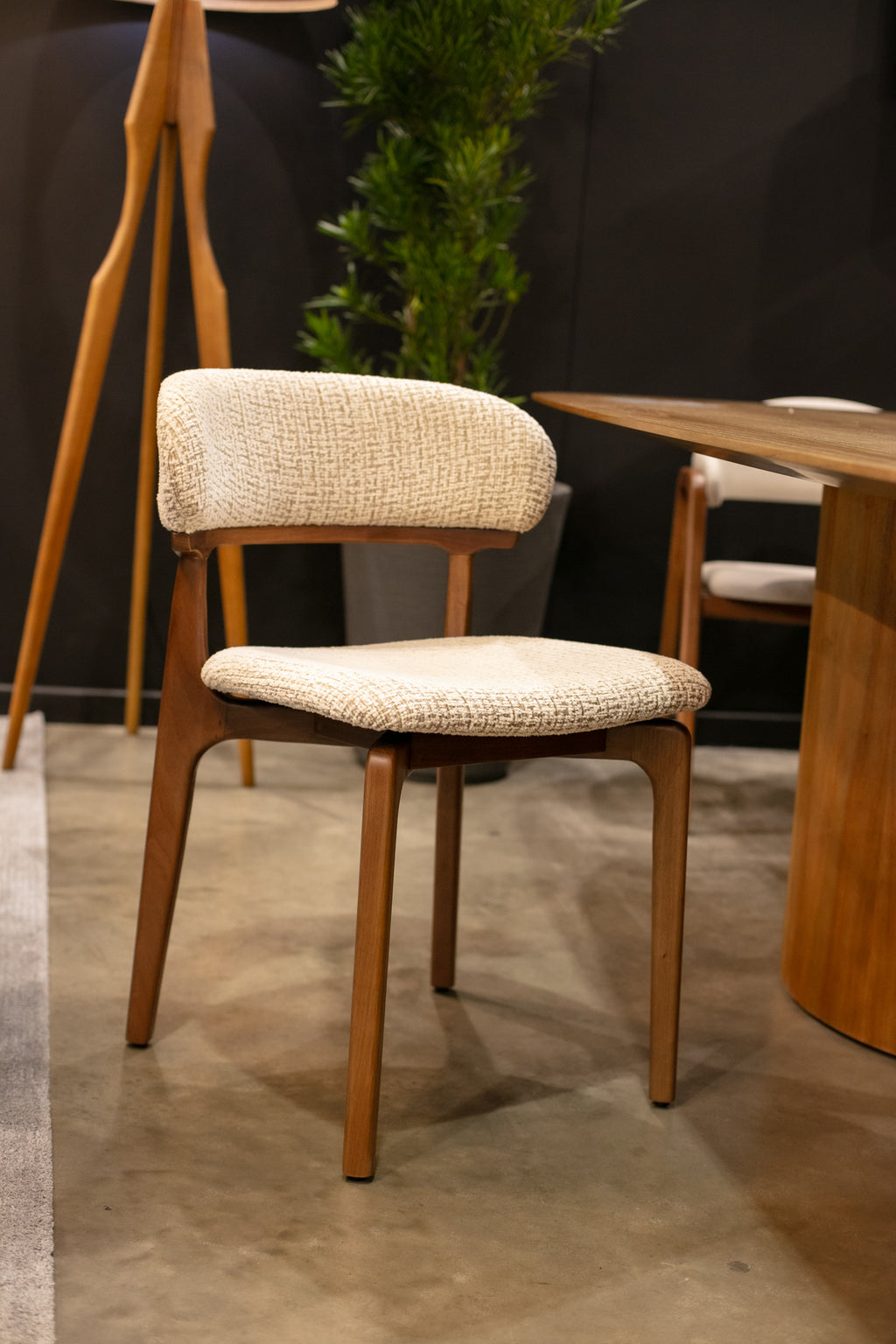 A estrutura em madeira natural apresenta curvas delicadas que valorizam o design e garantem ergonomia, tornando-a ideal para salas de jantar, espaços gourmet, restaurantes e ambientes corporativos.